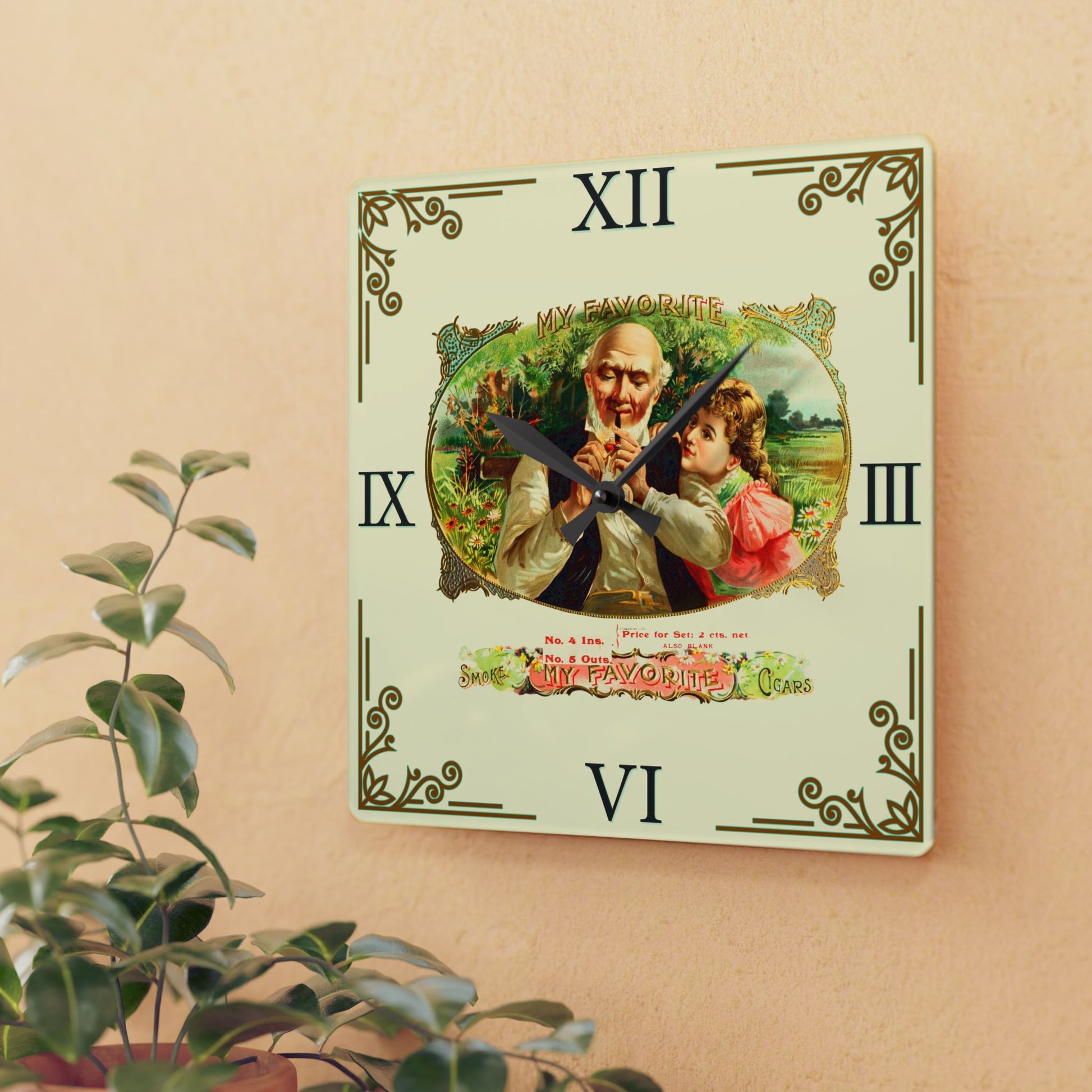 Elevate your decor with our stunning My Favorite Cigar Box Label Clock, a perfect addition to your cigar lounge, man cave, whiskey room, or home bourbon bar. Measuring a versatile 10.75" x 10.75", this easy-to-hang clock features a unique vintage retro cigar box label design. The design adds a touch of sophistication and nostalgia to your space while keeping you on time for your next smoke session. Whether you're a cigar aficionado or simply appreciate vintage artistry, this clock is sure to be a conversation starter and a stylish accessory for any setting. Don’t miss out on this timeless piece!