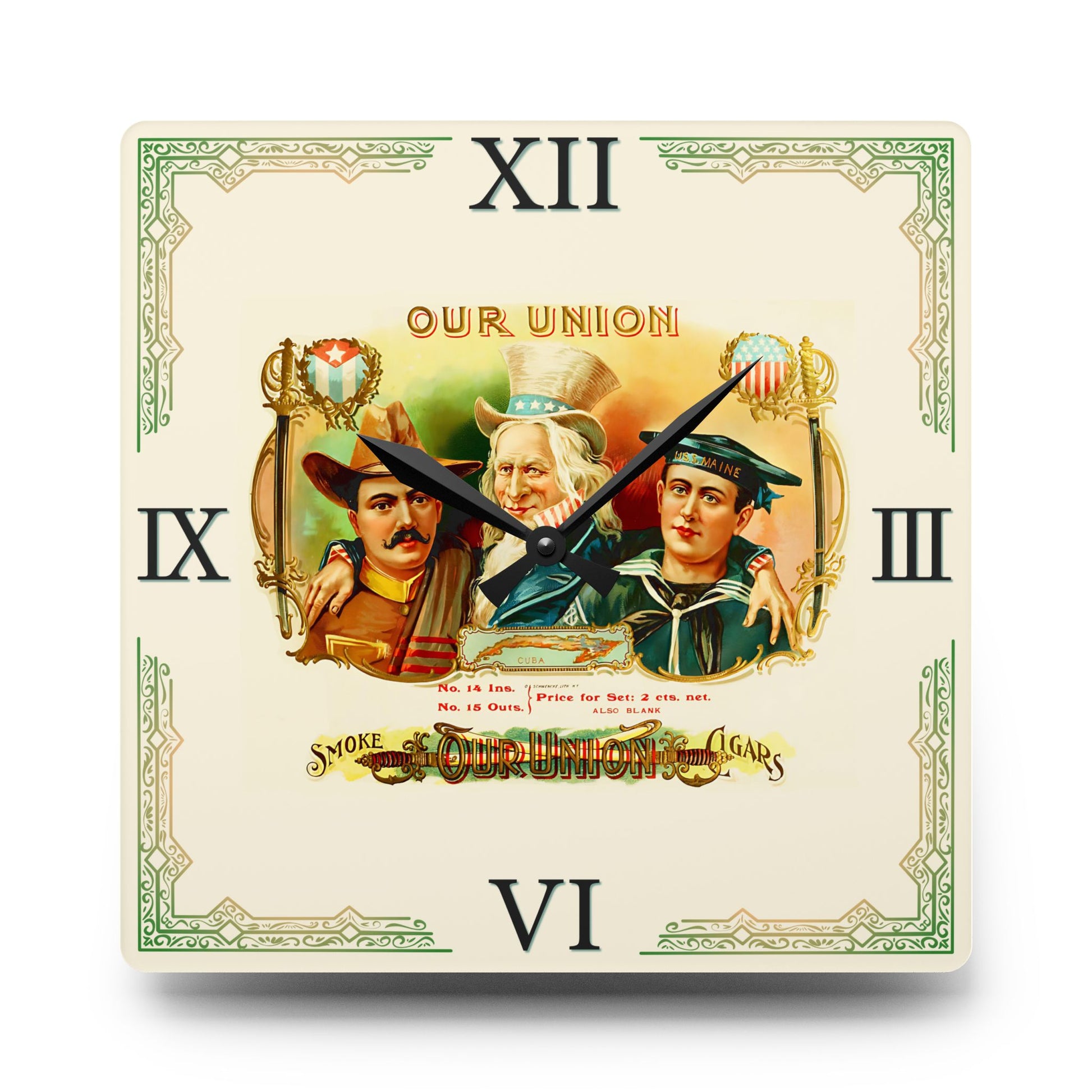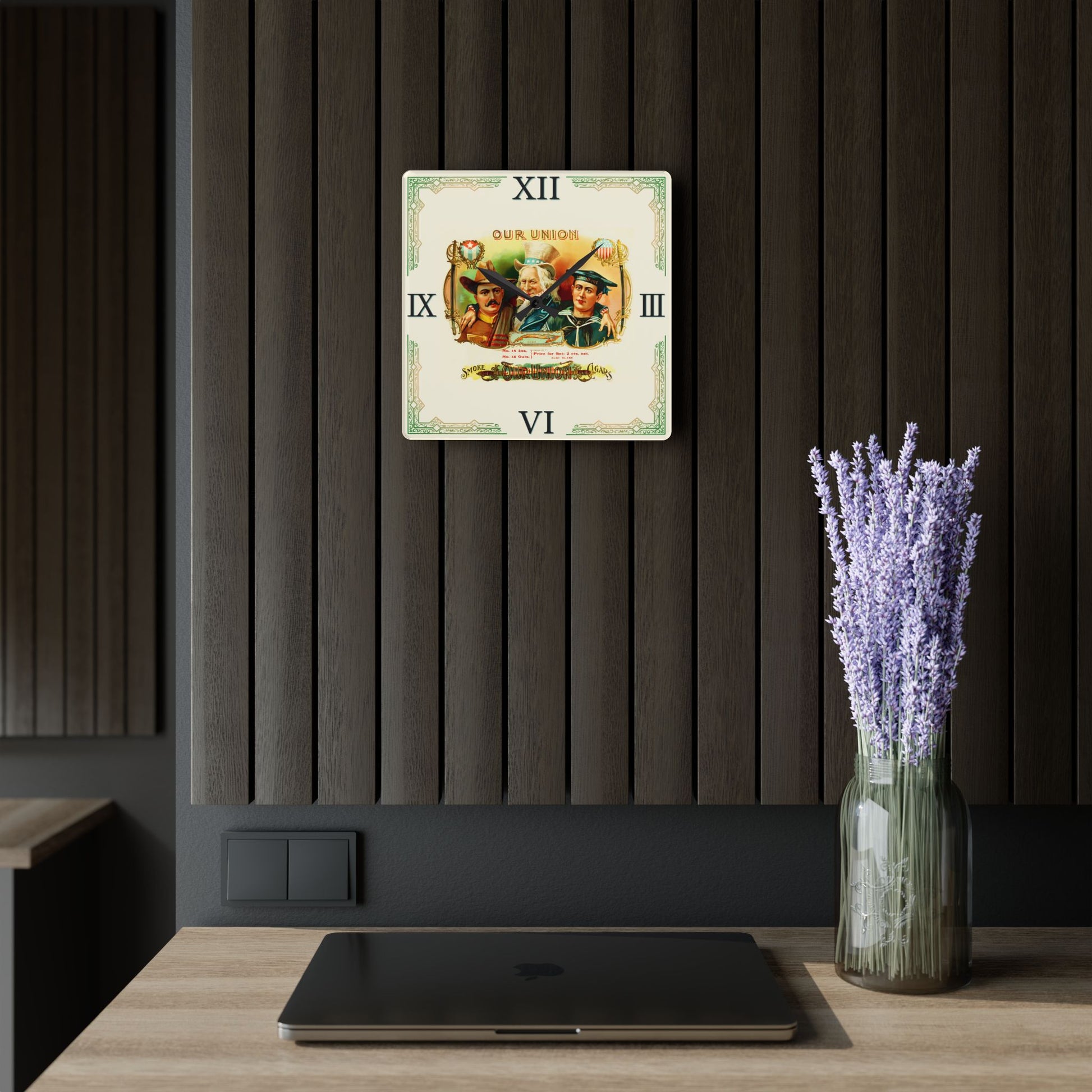 Elevate your decor with our stunning Our Union Cigar Box Label Clock, a perfect addition to your cigar lounge, man cave, whiskey room, or home bourbon bar. Measuring a versatile 10.75" x 10.75", this easy-to-hang clock features a unique vintage retro cigar box label design. The design adds a touch of sophistication and nostalgia to your space while keeping you on time for your next smoke session. Whether you're a cigar aficionado or simply appreciate vintage artistry, this clock is sure to be a conversation starter and a stylish accessory for any setting. Don’t miss out on this timeless piece!
